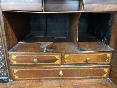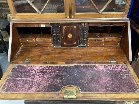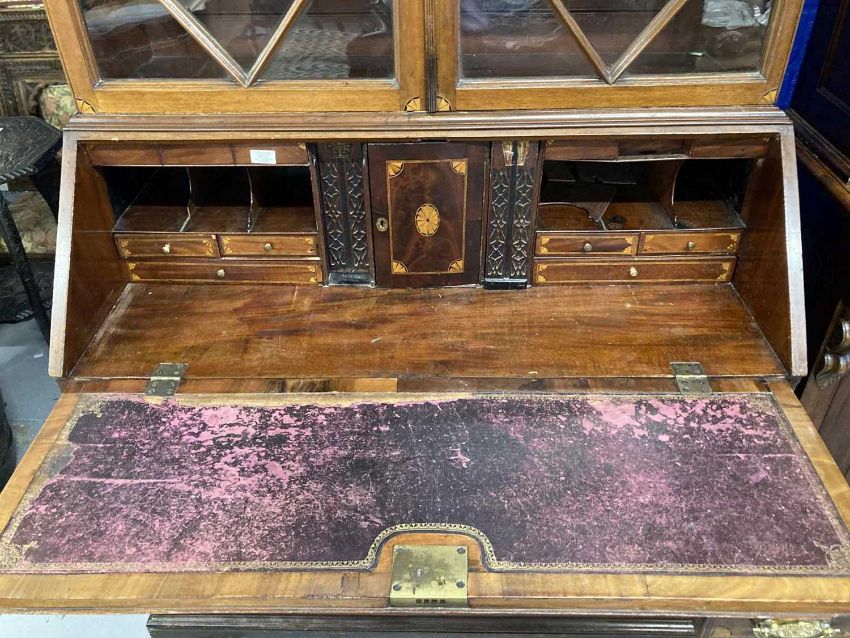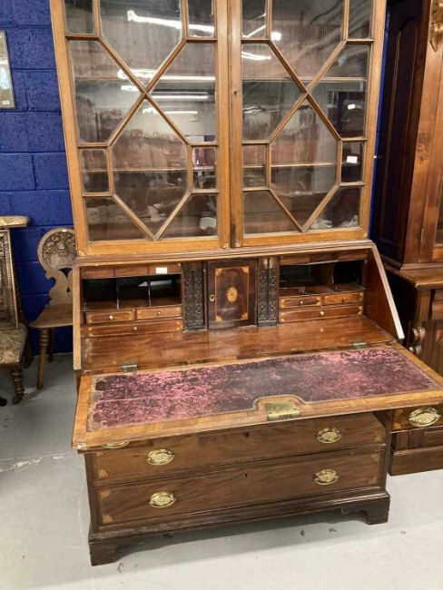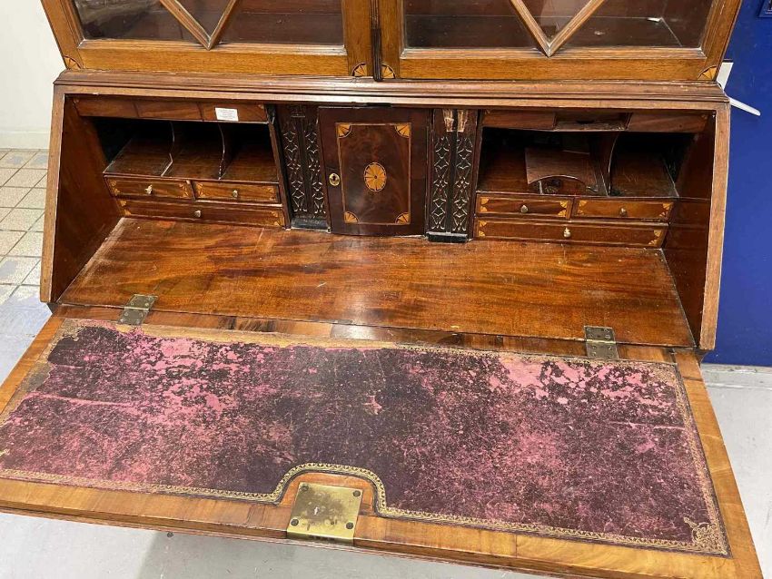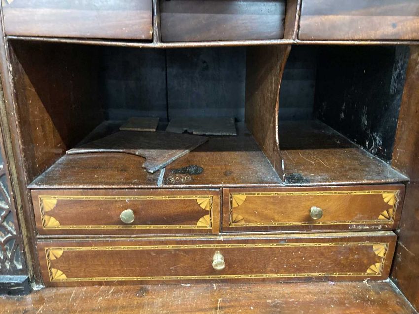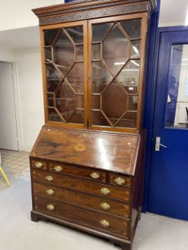 Furniture: Late 18th cent. Mahogany bookcase bureau drop-flap, fully fitted interior, three over three drawers, brass furniture, shell cartouche to the drop-flap, interior drawers and cupboards, the bookcase with three adjustable shelves, the whole on bracket supports. 44ins. x 89ins. x 23ins.