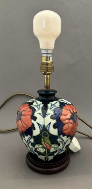 Ceramics: A Moorcroft Pottery lamp decorated in the New Poppy pattern, designed by Rachel Bishop. 26cm to top of fitting.CONDITION REPORT. Appears to be in good condition free from chips, cracks or repairs.