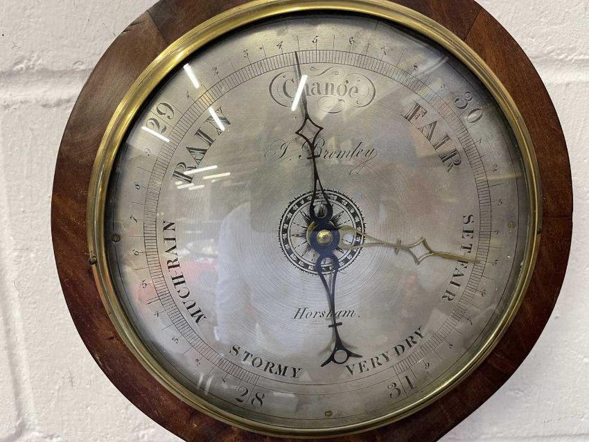 Scientific Instruments: Mahogany cased wheel barometer by John Bromley, born East Grinstead in 1779, moved to Horsham in 1812 until 1839, this was made during that period. Overall height 98cm.