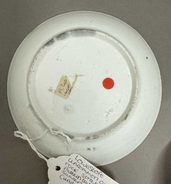 Ceramics: From a private collection of primarily English 18th and 19th century pieces, to include Worcester, Lowestoft, Liverpool, Caughley, Derby, etc; a 19th century Copeland & Garratt 'Dolls House' pattern plate, a similarly patterned trio with a Sotheby's label to the rear, and a Lowestoft tea bowl and saucer.