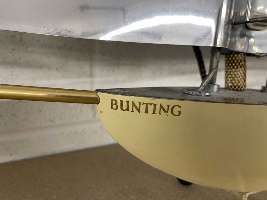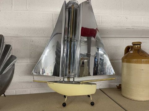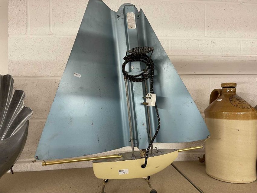 Decorative Arts: A 1950s electric heater in the form of a yacht by Bunting, McConnell & Co Ltd. Aluminium sails with central heater raised on a metal hull base, upon four legs, 74cm. Sold as collectors item only.