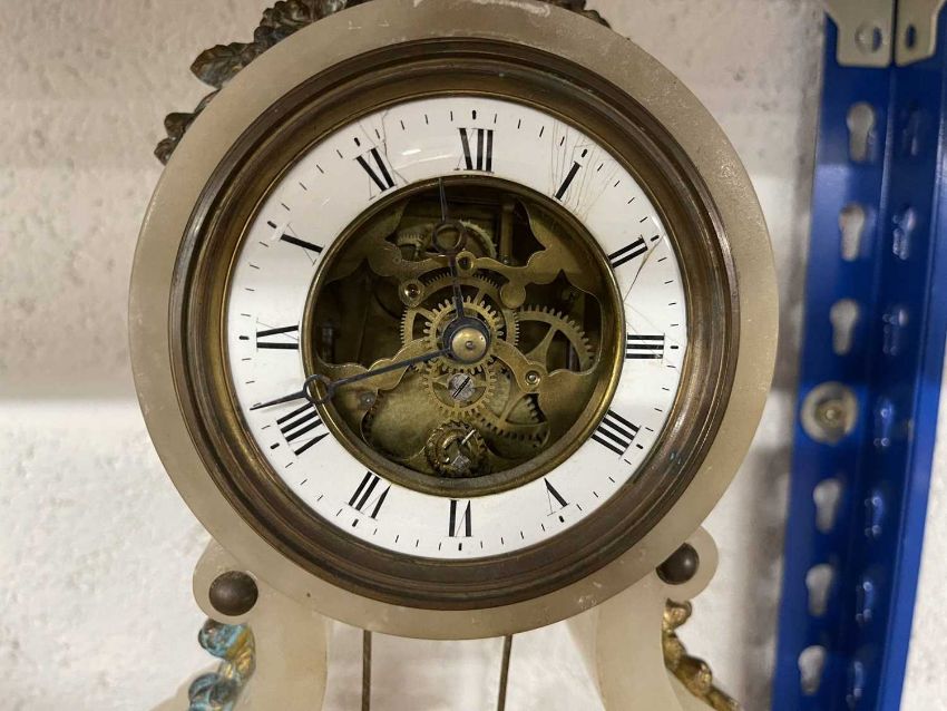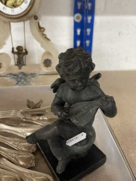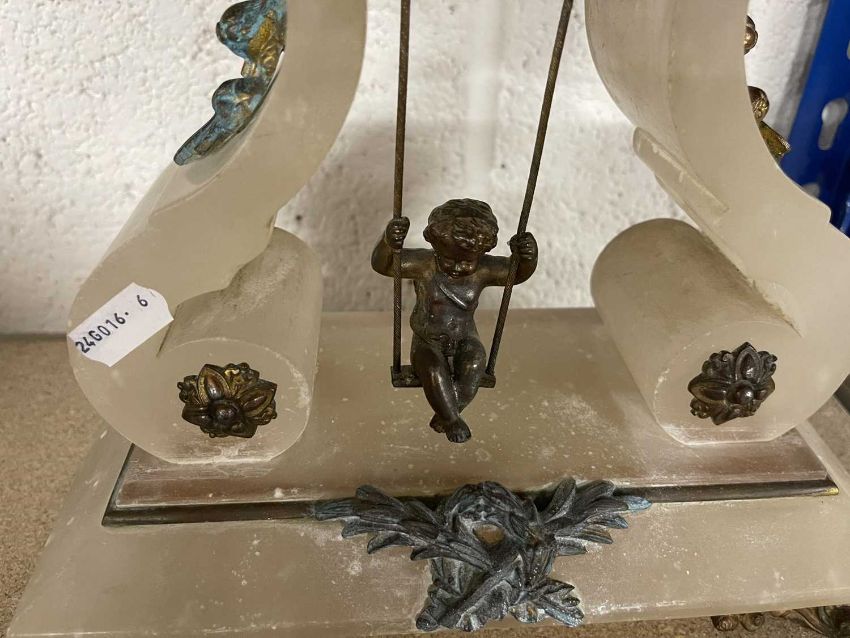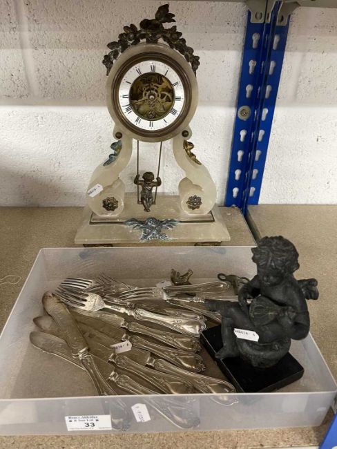 Clocks: An alabaster mantel clock with visible escapement, the pendulum a putto on a swing, 34cm. Together with a spelter figure of a seated cherub and a set of silver plated cutlery by Elkington.