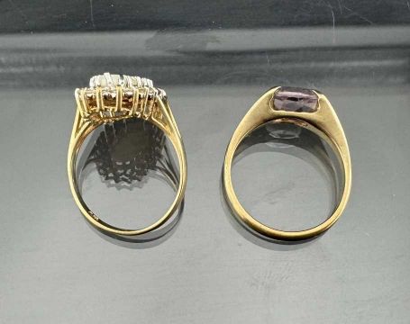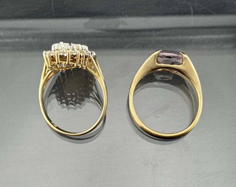 Jewellery: A 9ct gold ring with navette cut opal, 1.3cm by 0.5cm, within a border of CZ. UK size O, together with a 9ct gold ring set a single rose quartz, UK size O. Combined weight 6.6g.