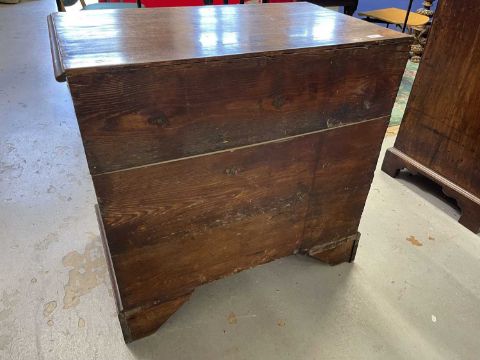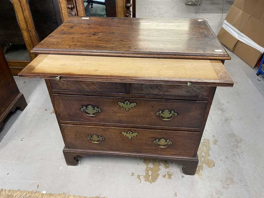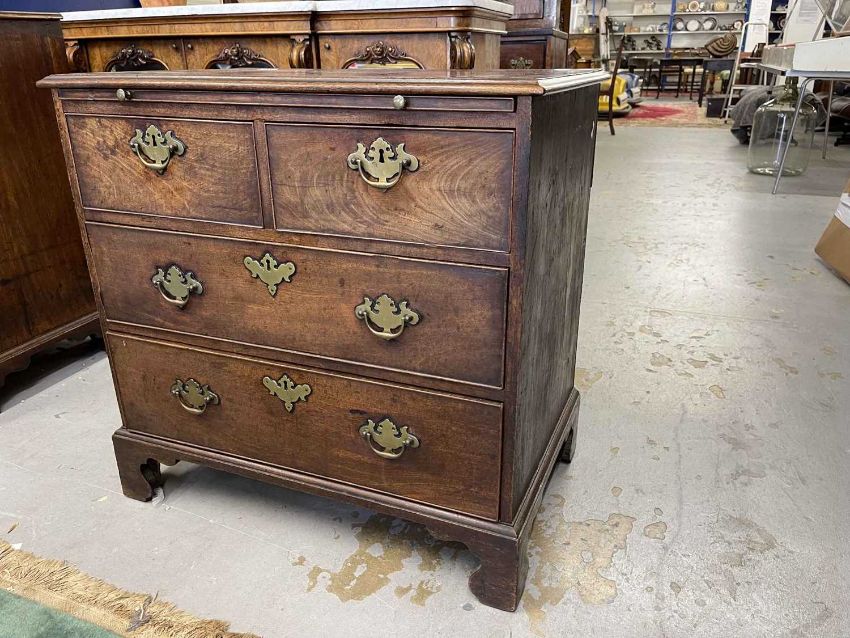 Furniture: A very good Georgian mahogany chest of drawers of small proportions with brushing slide. the cock beaded drawers with oak linings. wonderful colour and surface. no restorations or faults, c1790-1820. 77cm wide and 77cm high.