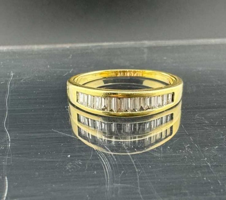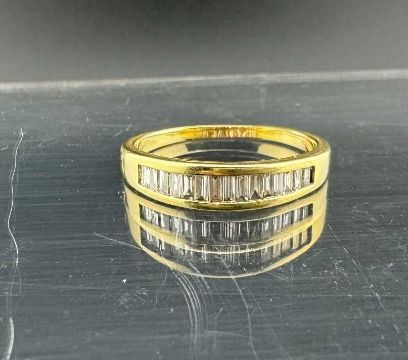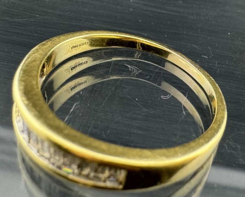 Hallmarked Jewellery: 18ct gold half hoop ring set with fifteen graduated baguette cut diamonds, estimated weight of (15) 0.55ct, ring size T. Weight 4.1g.