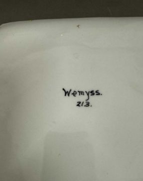 Ceramics: A Wemyss Pottery tray in the Jazzy Cabbage Rose pattern, 25.5cm by 20.5cm, marked Wemyss 213, together with a jam pot minus lid in the same pattern, short tight hairline to lip.