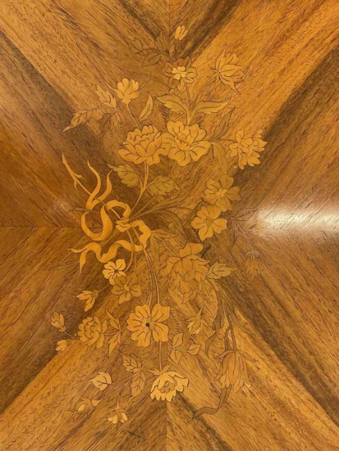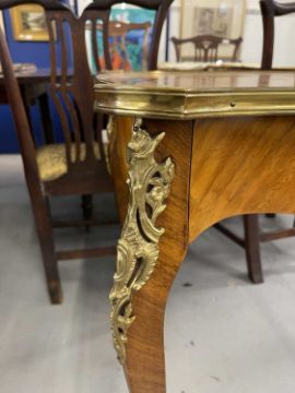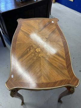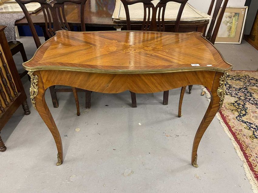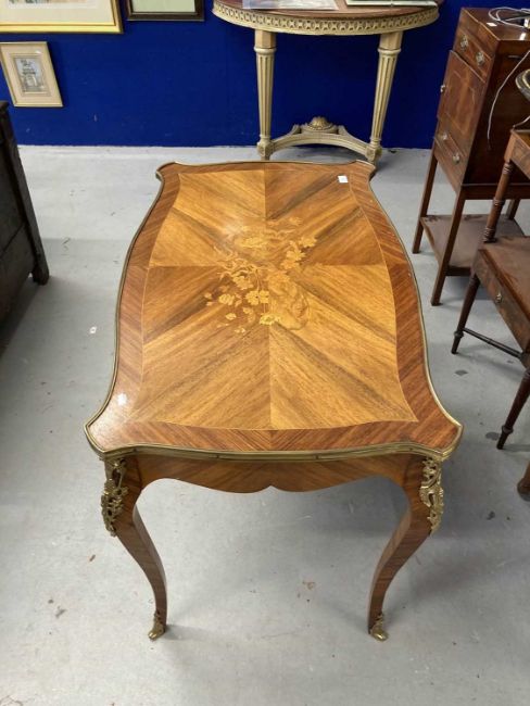 Furniture: FRENCH KINGWOOD SERPENTINE CENTRE TABLE IN LOUIS XV STYLE LATE 19TH CENTURYthe crossbanded top inlaid with floral marquetry, on cabriole legs 75.2cm high, 99.8cm wide, 58.6cm deep.