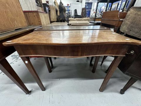 Furniture: George III Regency serpentine fold-over tea table on square cut moulded supports with inside chamfers. Width 90cm x height 71cm x closed depth 40cm. Plus a George III serpentine fronted fold-over card table c1800-182o, standing on square-faced blocked legs with inside chamfers, extends on scissor action to reveal a green felt playing surface. Width 85cm x depth closed 42cm x height 74cm.