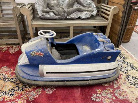 Toys: A late 1960s child's battery-operated glass fibre bumper car. 360-degree rotating chain-driven spin function. dark blue and chrome. Overall size including bumper trim, length 1.7m, width 75cm. (No battery)