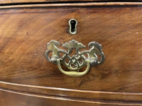 Furniture: Late 1820s mahogany bow fronted chest of drawers, two over three graduating drawers with flame curl figuring and all oak lined, handles replaced. Width 100cm x depth 47cm x height 1.06cm.
