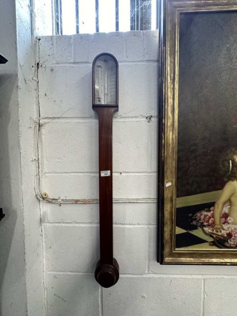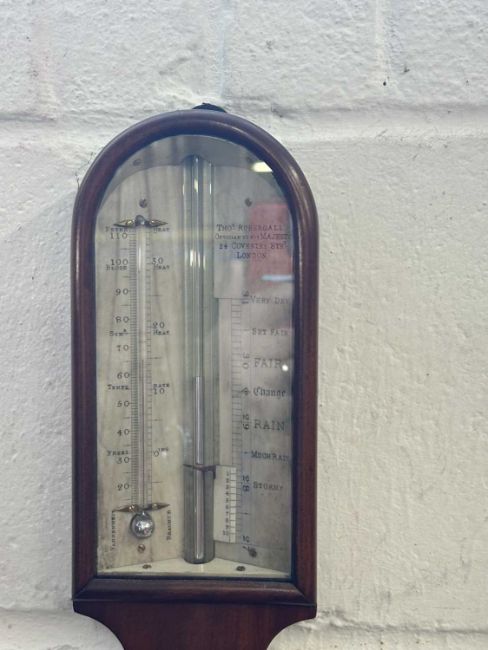 Scientific Instruments: An early 19th century mahogany stick barometer by Thomas Rubergall of Coventry St, London, with ivory backed mercury thermometer reading in Fahrenheit and Reaumers. 92cm.Ivory submission reference T7Q85Y4U