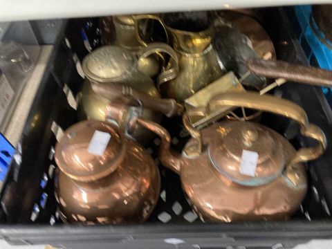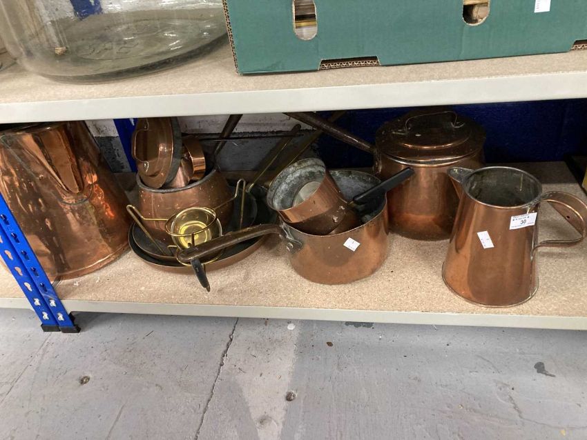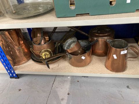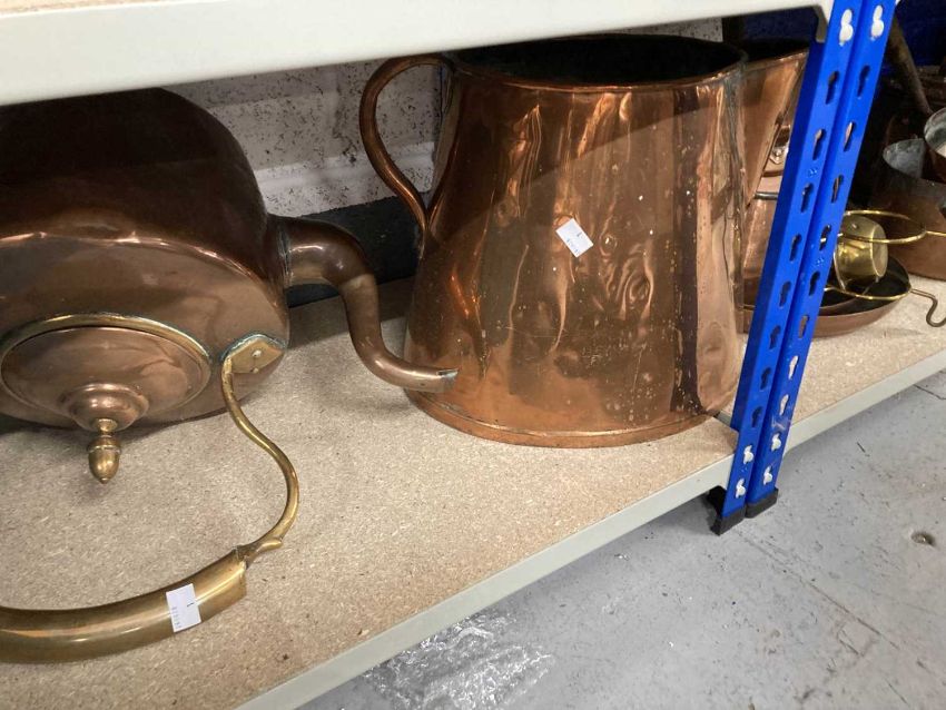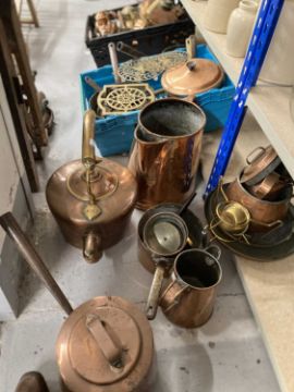 Metalware: An oversized copper kettle, with acorn finial to lid; another kettle, two jelly moulds, saucepans, a Jersey cream jug, together with a collection of assorted brassware including trivets and jugs. All ex Bear Hotel, Devizes.