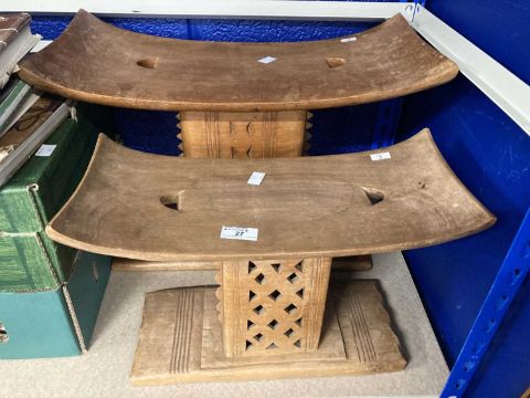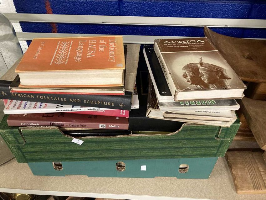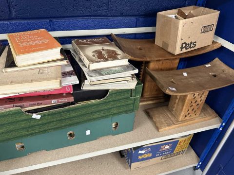 Ethnographica: An Ashanti stool, geometrically carved and pierced, 36.5cm high; another, 27cm high; three model examples, a Hausa (Northern Nigerian) inkpot with pen holders, another, and a number of 20th century books on African art and history, mainly relating to Nigeria.