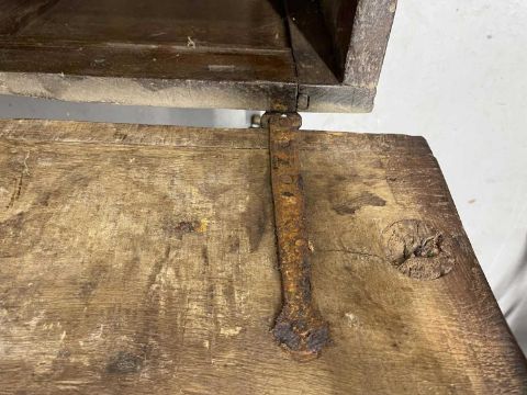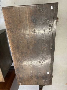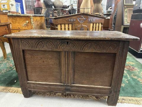 Furniture: Wellproportioned English oak coffer c1780-1800, the two panelled front with central mullion with incised carved repetitive decoration to the top rail, raised on styled legs with original iron strap and ring hinges. Overall length 105cm, height 65cm, depth 50cm.