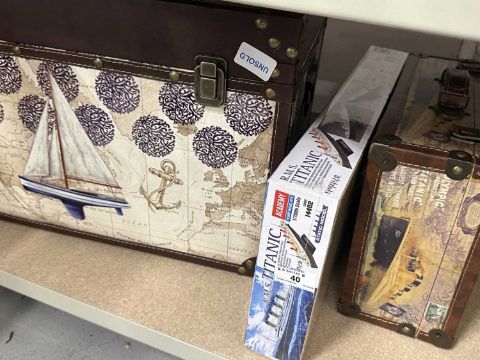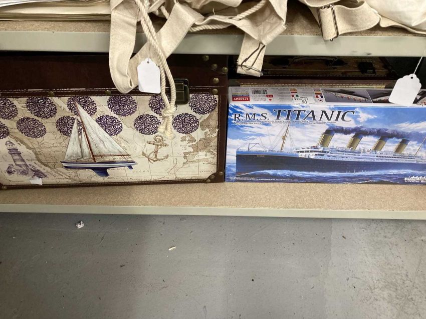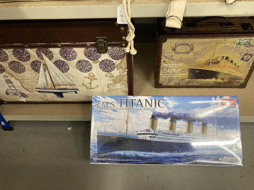 Travel: A leather bound small cabin trunk decorated with a yacht impressed on an ocean chart, an attache ase leather bound decorated with Olympic Titanic impressed on an ocean chart and an unopened hobby model of RMS Titanic 1/700 scale.