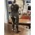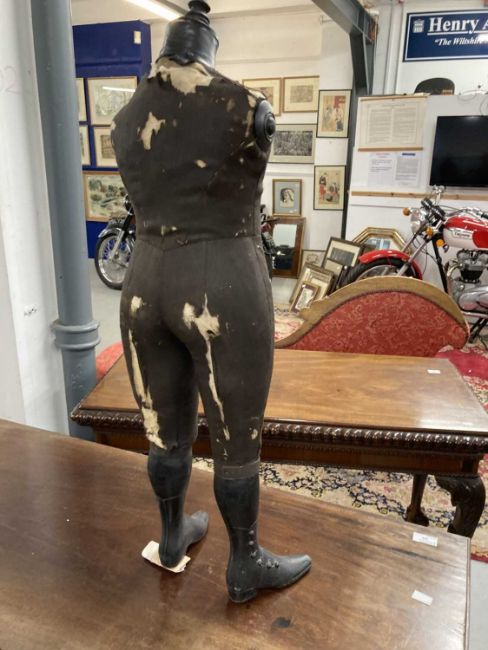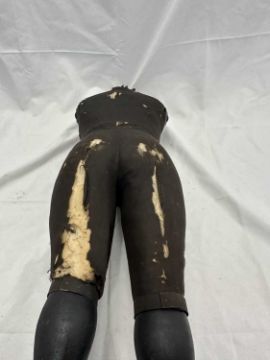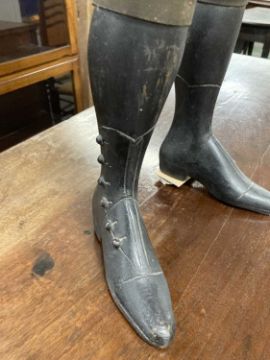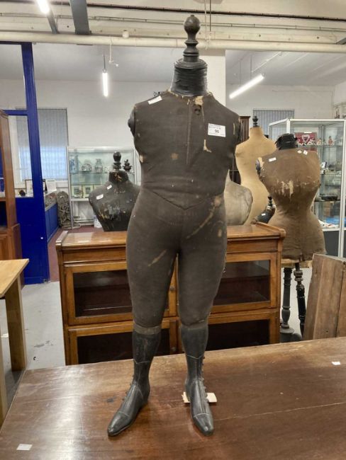 Textiles - Tailors Dummy: Floor standing French child mannequin, silk covered standing on wooden ebonised carved boots, together with ebonised ring turnings on the shoulders and neck, circa 1900-1910, overall height 44cm with age-related wear