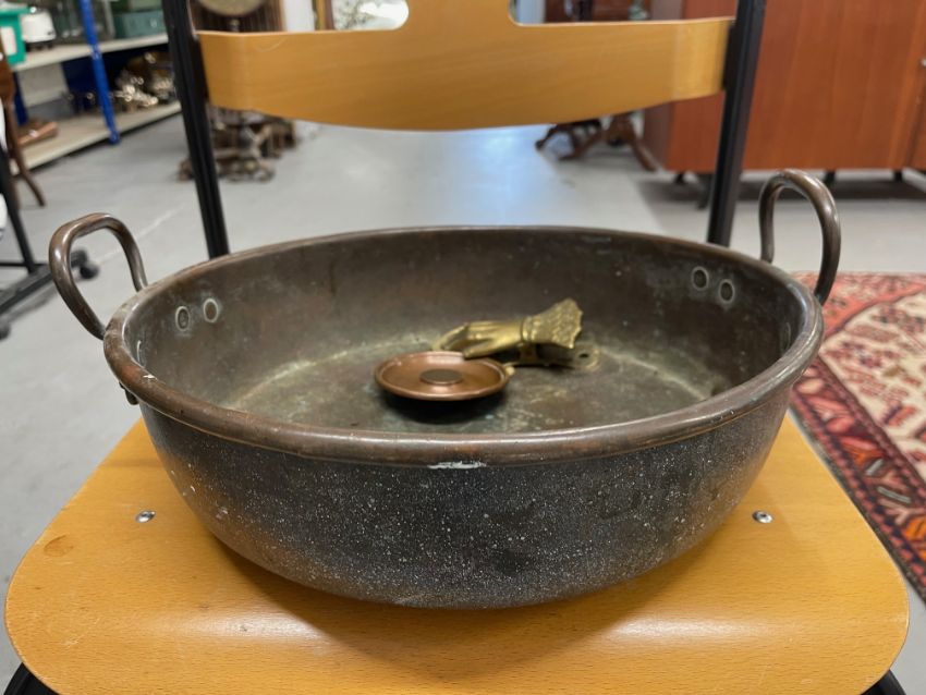 Metalware: Mixed group of copper and brass to include a copper riveted washtub c1880, a Victorian brass jam pan and two novelty items.