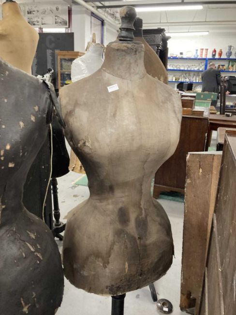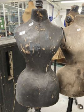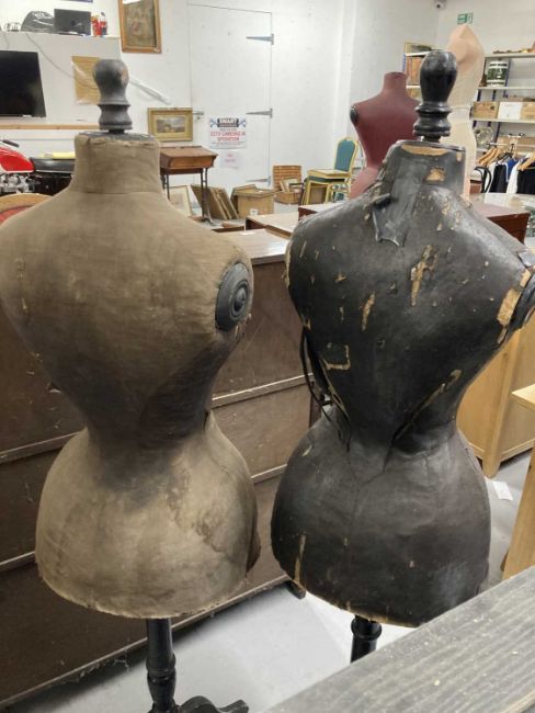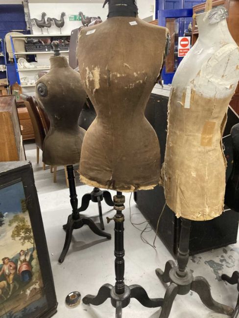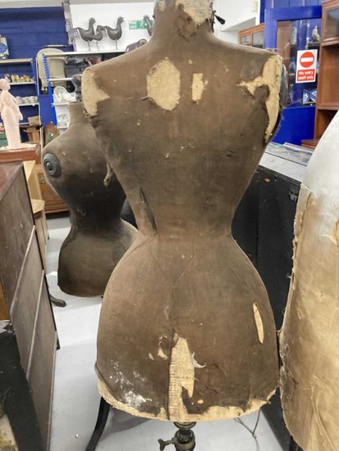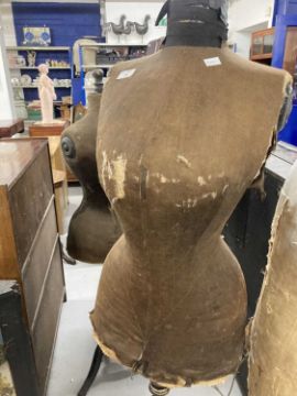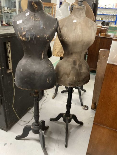 Textiles/Tailors Dummies: Early Edwardian wasp-waisted French silk mannequin on an ebonised tripod stand with adjustable height rise and fall with age-related wear, circa 1900. Plus a large-size French silk-covered mannequin circa 1900-1910 on an ebonised tripod stand with adjustable rise and fall, ebonised roundels on the shoulders and neck showing French print to the linings. Overall height of body 80cm. Early 20th cent. French wasp-waisted mannequin with ebonised tripod, ebonised stand with roundels to the shoulders, adjustable height, overall body height 66cm.