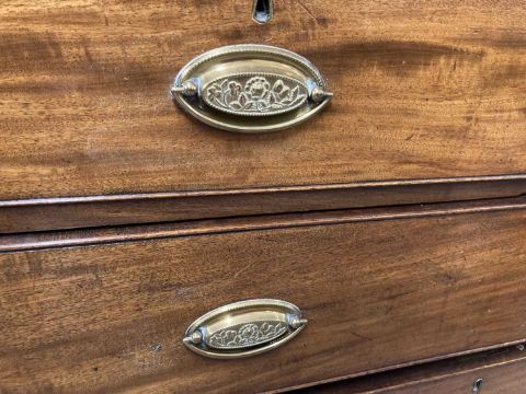 Furniture: Mahogany chest of drawers. 2 long, 2 short on swept brackets. 44ins. x 31ins. x 19ins.