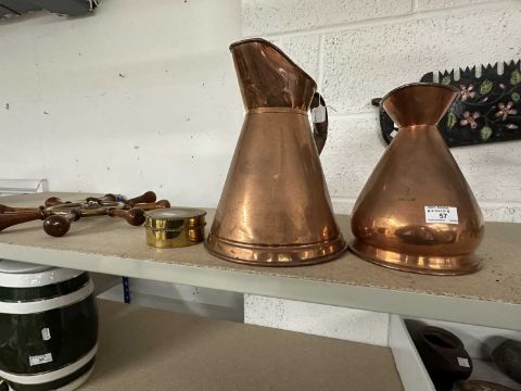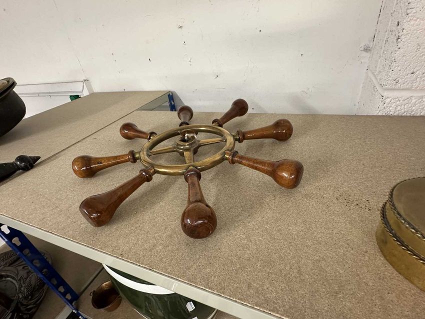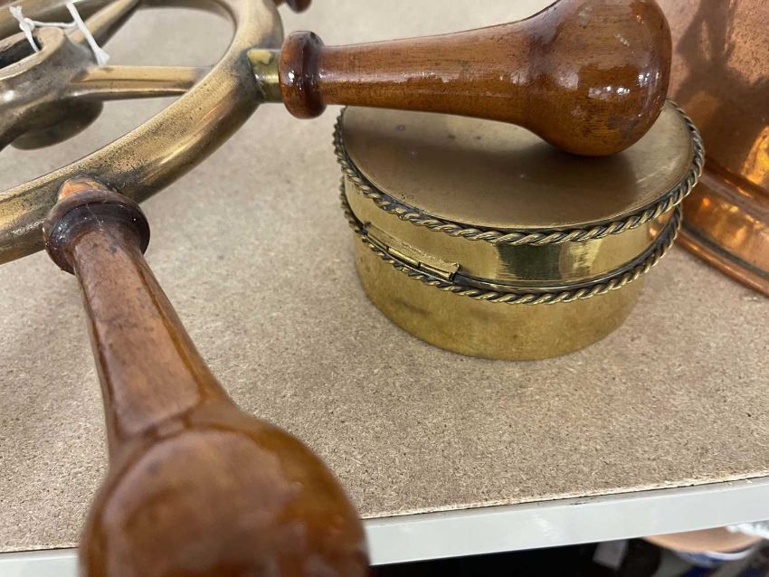 Metalware: Copper 1 gallon jug with crown stamp, ½ gallon jug, a brass round hinged lidded box and a brass and treen ship's wheel.