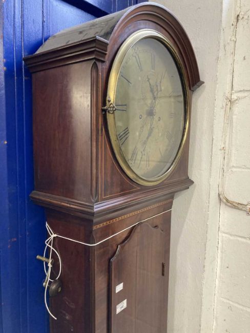 Clock: 19th Century Scottish mahogany longcase clock. Brass Dial 13in