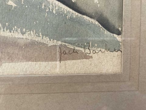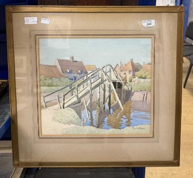 British School: E. Brown watercolour c1920-1930 'The Kissing Bridge' signed lower right framed under glass, overall size 53cm x 52cm. Plus a watercolour by Jack Barker 'Hillside Farm' 1921 signed in pencil lower right, framed under glass, image sight size 36cm x 26cm. (2)
