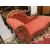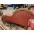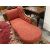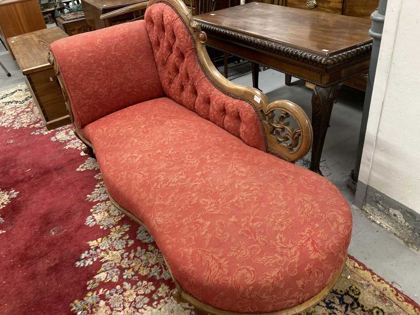Furniture: Victorian walnut framed upholstered chaise lounge c1890-1900, button back with serpentine front, red ground with leaf pattern, length 1.7m.