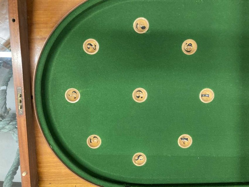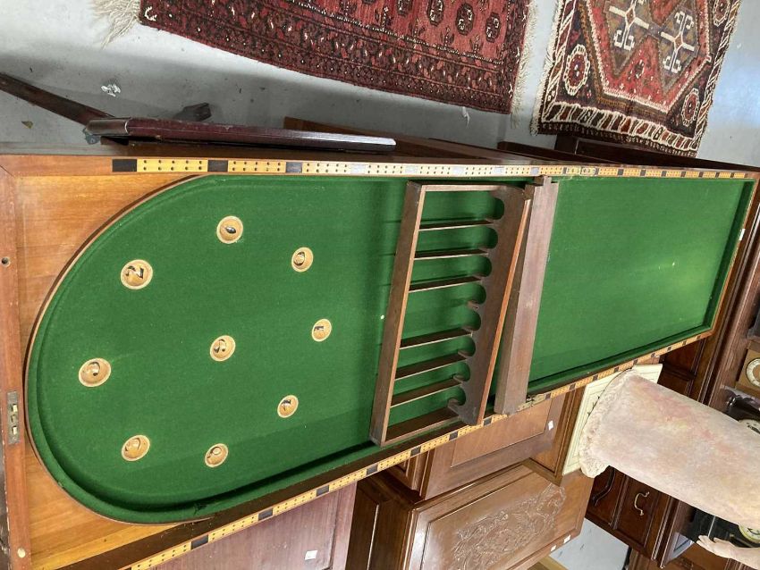 Toys & Games: 19th cent. Folding bar-billiard Bagatelle game, mahogany cased, green baize. 212cm long, 55cm wide, 14cm deep, 106cm folded.
