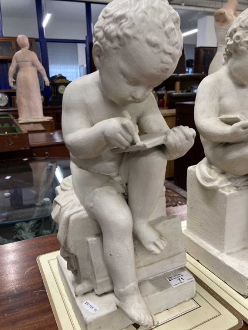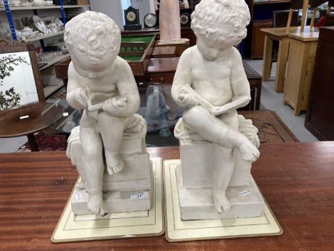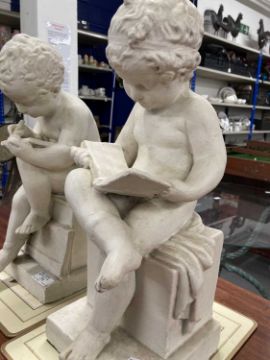 Ceramics: A pair of painted plaster cherubs, one depicted reading, the other writing. 43cm and 41cm high.