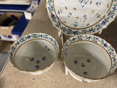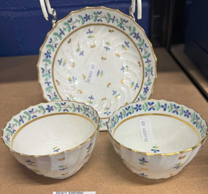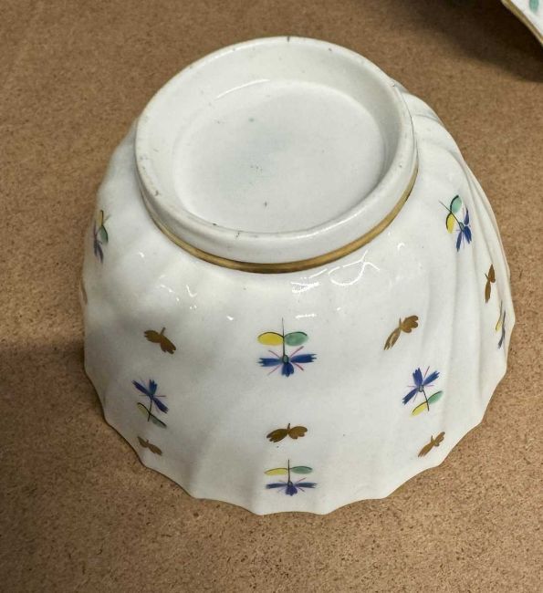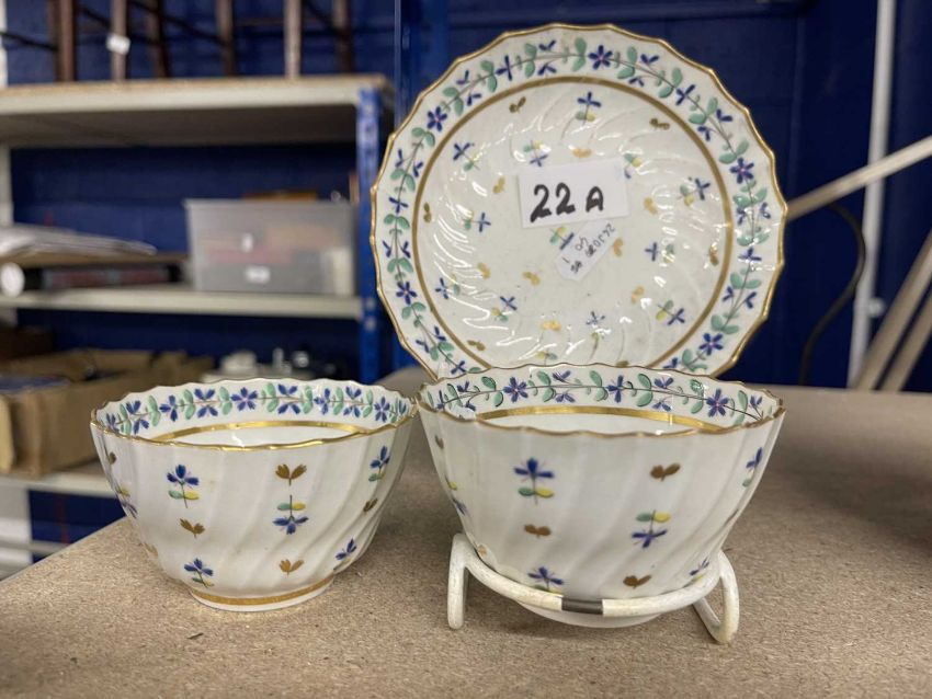 Decorative Arts: A late 18th C Flight Worcester tea bowl, with wrythen design and painted with a regular pattern of stylised flowers, 8.4cm, signed 'Flight' to the underside, together with a similar tea bowl, unsigned, and a single matching saucer.