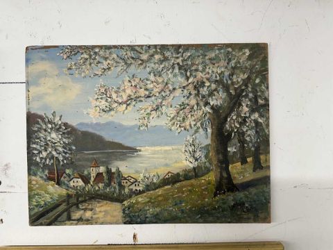 Artwork: A set of four oils on board of landscape scenes, three framed, all signed F. Kruger. Visible image 38cm by 28cm.