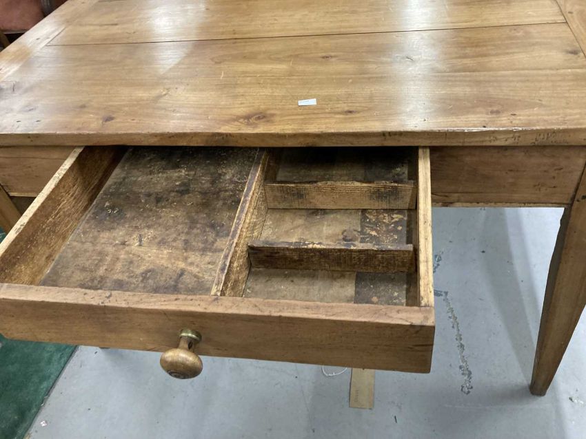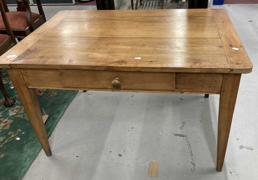 Furniture: French cherry wood kitchen table c1800-1900, four planked top with cleated ends, single drawer, straight legs, 120cm x 81cm x 72cm.