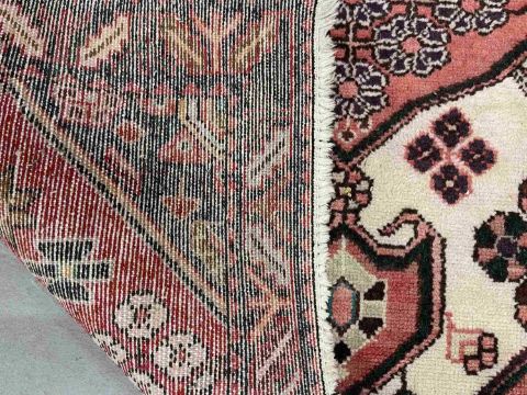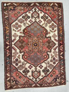 Rugs & Carpets: Persian hand knotted 100% wool, central medallion style with red ground, beige/cream stylised borders c1970s. 1.5m x 1.1m