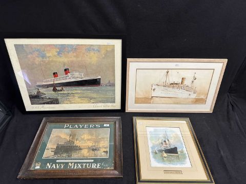 OCEAN LINER: Cunard Mauretania Agents print, Stephen Card ink wash of Carthage, Players Navy Mixture advertisement in original frame, etc. 48cm x 35cm. (4)