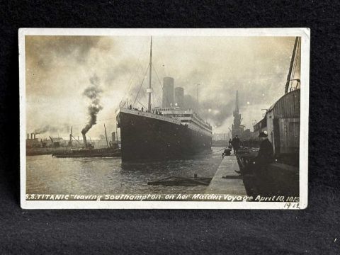 R.M.S. TITANIC: Real photo postcard of Titanic leaving Southampton.