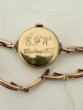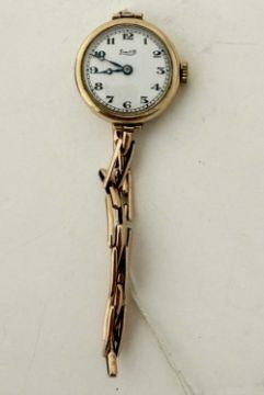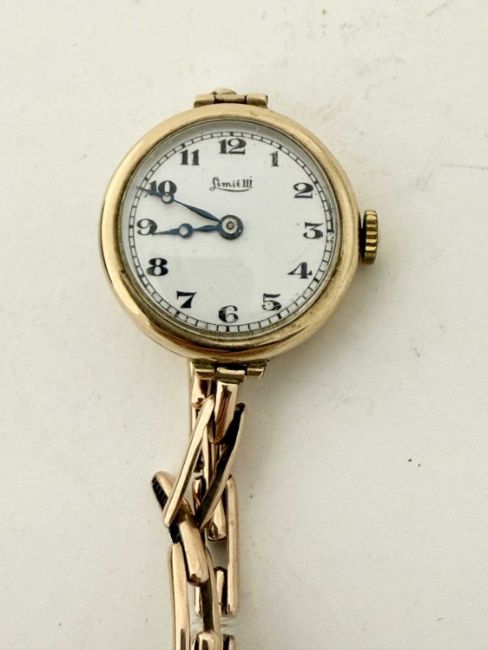 Watches: A ladies 9ct gold watch, Birmingham 1930, on expanding 9ct gold strap. Dial signed 'Limit III'. 2.7cm wide including crown, 18.0g gross.