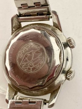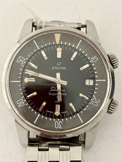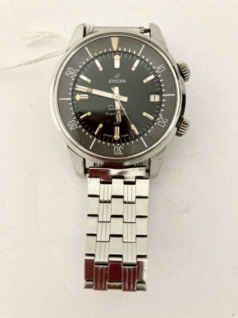 Watches: Stainless steel Enicar Sherpa Super Dive 33 having a mechanical movement, black dial with date at 3 o'clock and a grey bezel on a stainless steel bracelet.