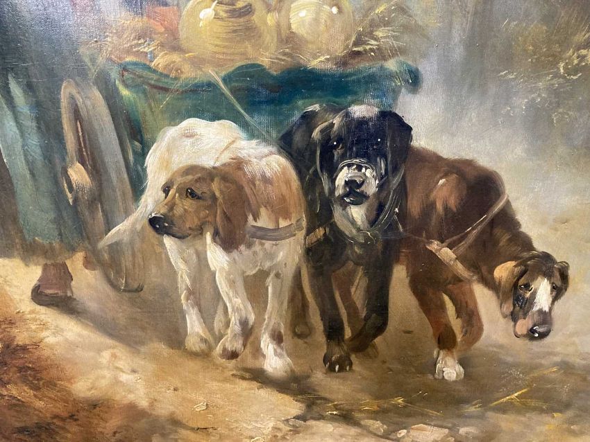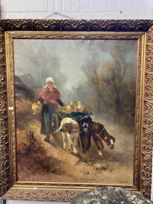 Henry Schouten (Belgian 1864-1927): Oil on canvas The Milkmaid, with three dogs pulling a cart, oil on canvas within a gilt and gesso frame, early 20th century, signed lower right, overall size 120.3cm x 110.3cm.