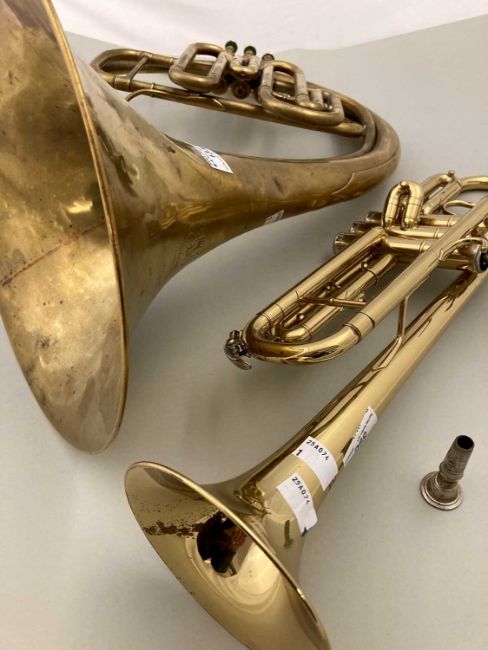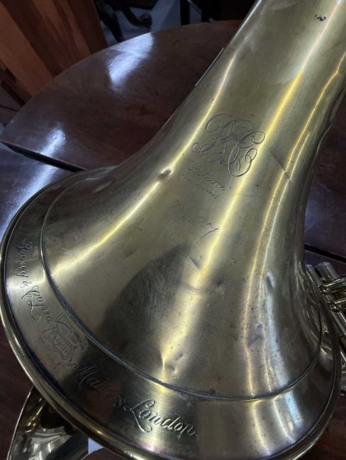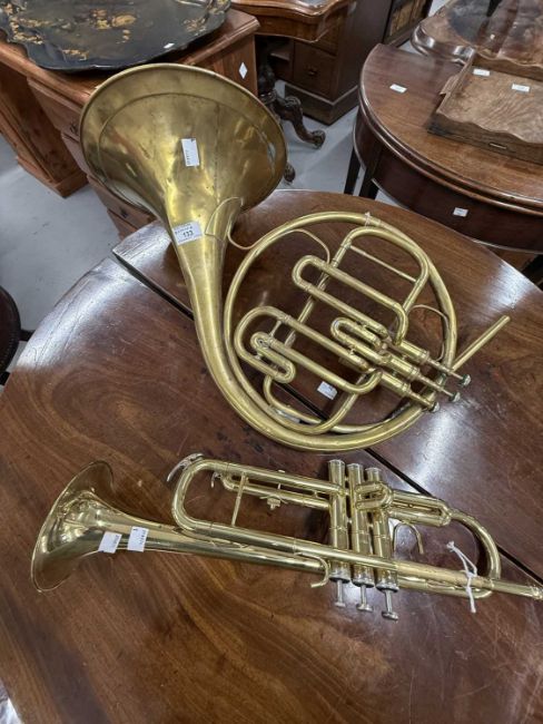 Musical Instruments: Boosey and Co French horn plus a trumpet. (2).