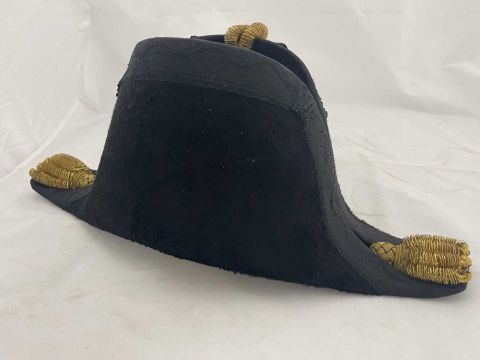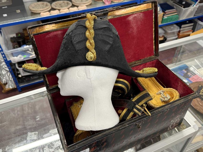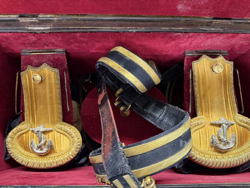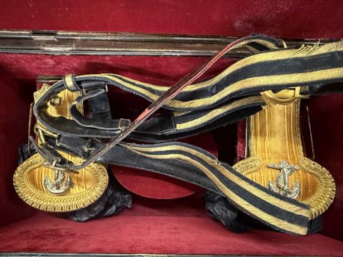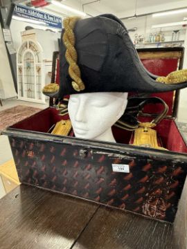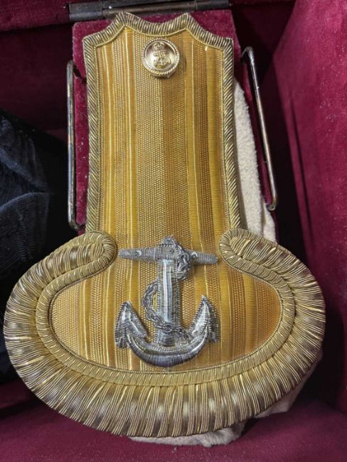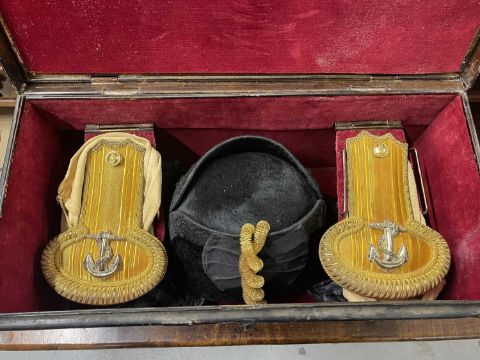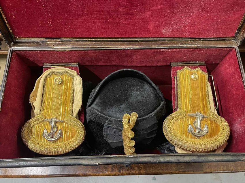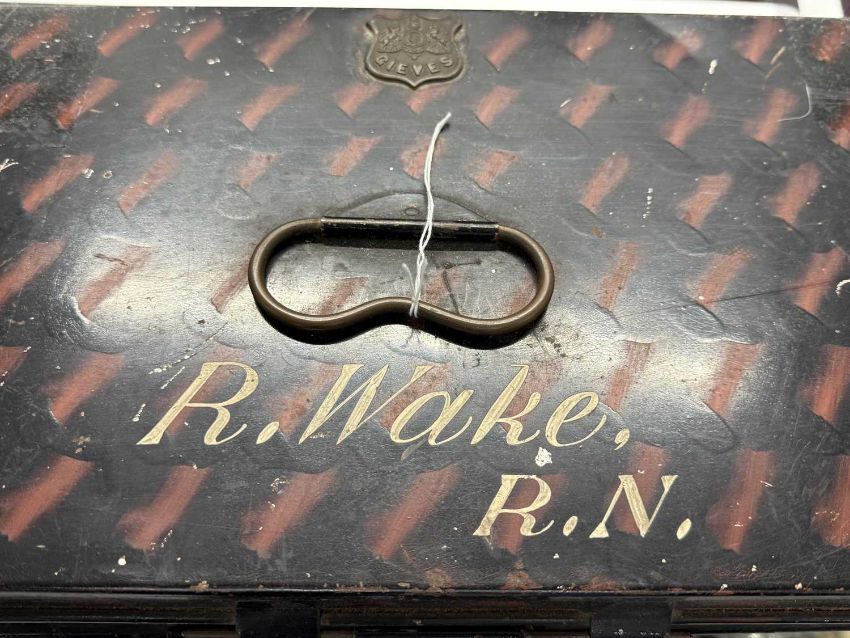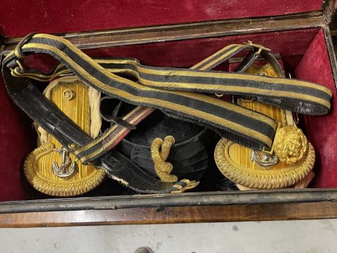 Militaria: A Royal Naval officer's gold braided bicorn hat, epaulettes and belt in original Gieves painted tin box, named to Lt Commander Roger Wake.Roger Wake was designated trainer for the newly formed Commando brigade in the early 1940s. Their recruits included volunteers from the Royal Marines, and at his funeral in 1988 a contingent of former Commandos turned up to pay their last respects.