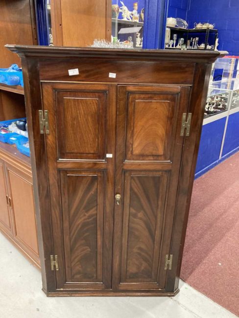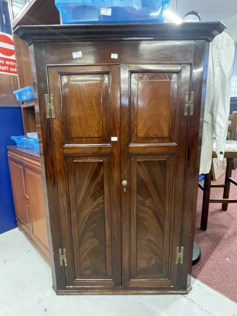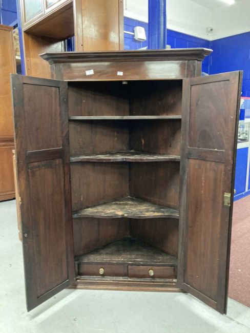 Furniture: George III mahogany wall mounted corner cupboard twin panelled door opens to reveal shaped shelves with two drawers beneath.