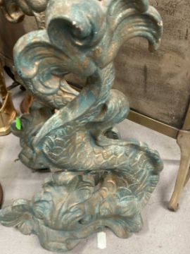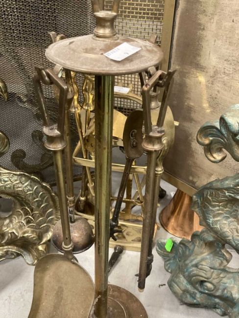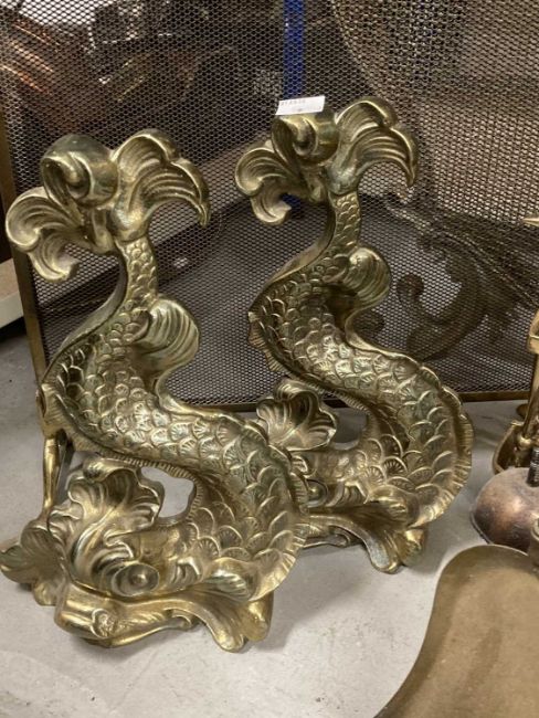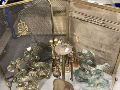 Metalware: 19th/20th century fire grate furniture, three brass fire screens, four cast brass doorstoppers in the form of dolphins, two sets of brass fire tools and a copper post horn.