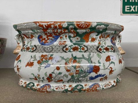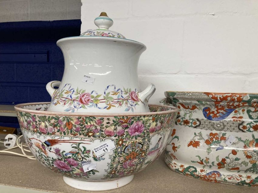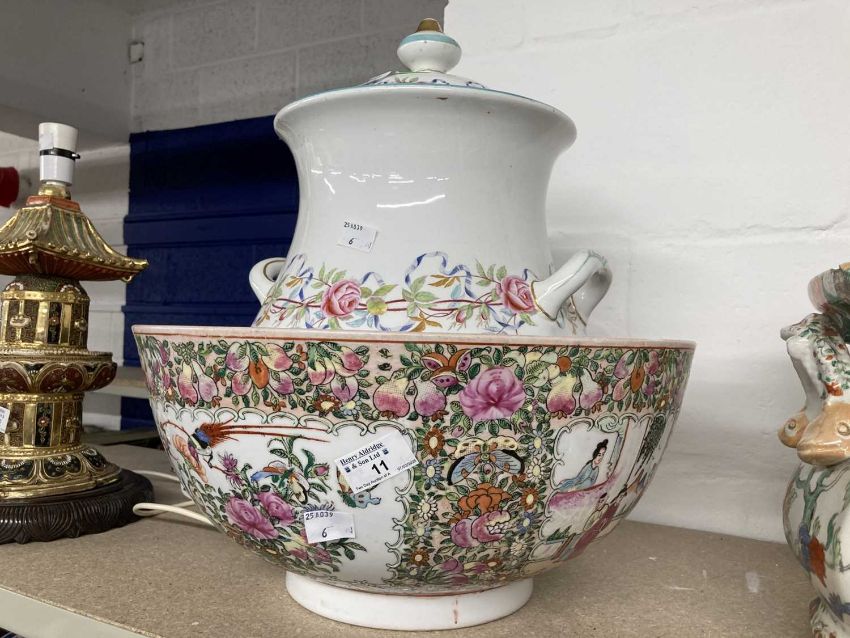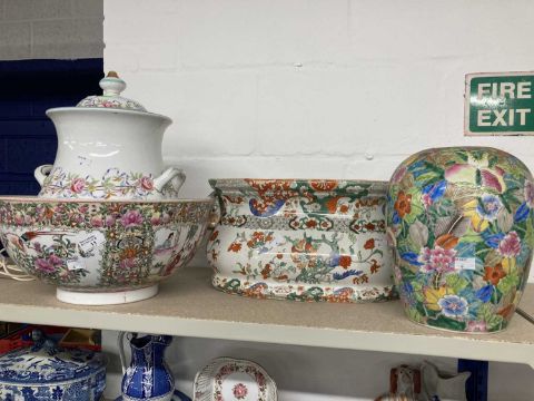 Porcelain: 20th century Oriental famille rose and British including a large bowl, floral jar (no lid), large Copeland jar A/F, a floral decorated footbath A/F.