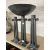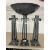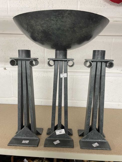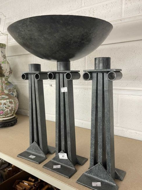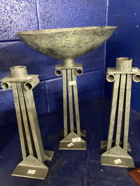 Metalware: Al Frank designs cast metal altar garniture in the Brutalist style consisting of a central incense burner and two candlesticks 49cm and 40cm tall.