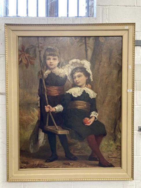 Charles Palmer Downing RA (1847-1902): Romantic School oil on canvas full length portrait of two sisters one seated on a rope swing, in a naturalistic wooded parkland setting, relined, no losses to image, circa 1900 in a contemporary frame, overall size 90cm x 170cm.