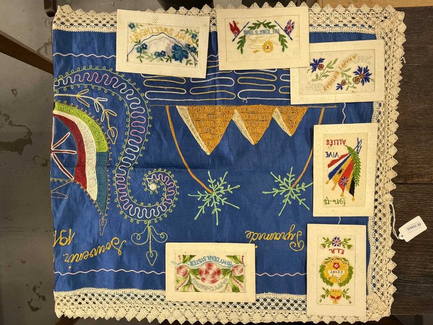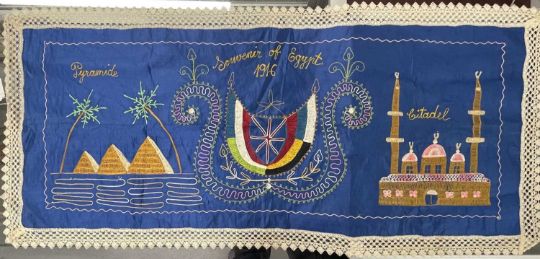 Needlework: An early 20th century Egyptian needlework depicting the pyramids and temples around the flags of the allies and the date 1916, a deep blue ground with lacework border, 105cm by 49cm, together with a small group of WW1 silk postcards.
