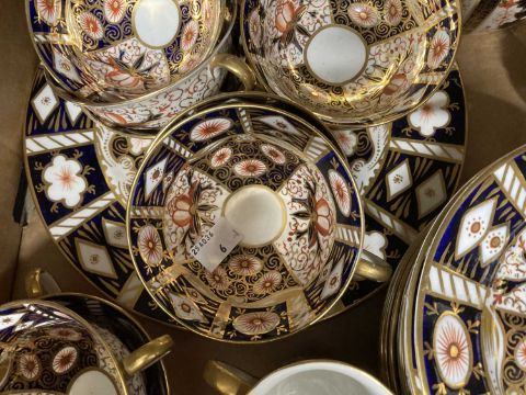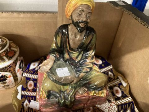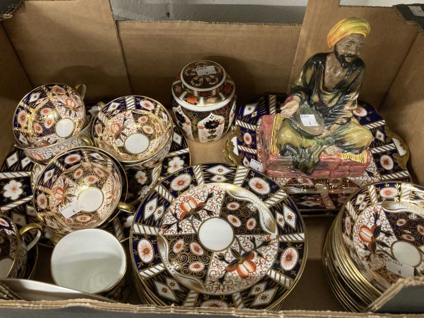 Ceramics: Royal Doulton figurine. HN1365.C ''Mendicant'' Boxed set of French salts plus a large quantity of imari pattern unmarked tea ware and Crown Derby lidded jar.