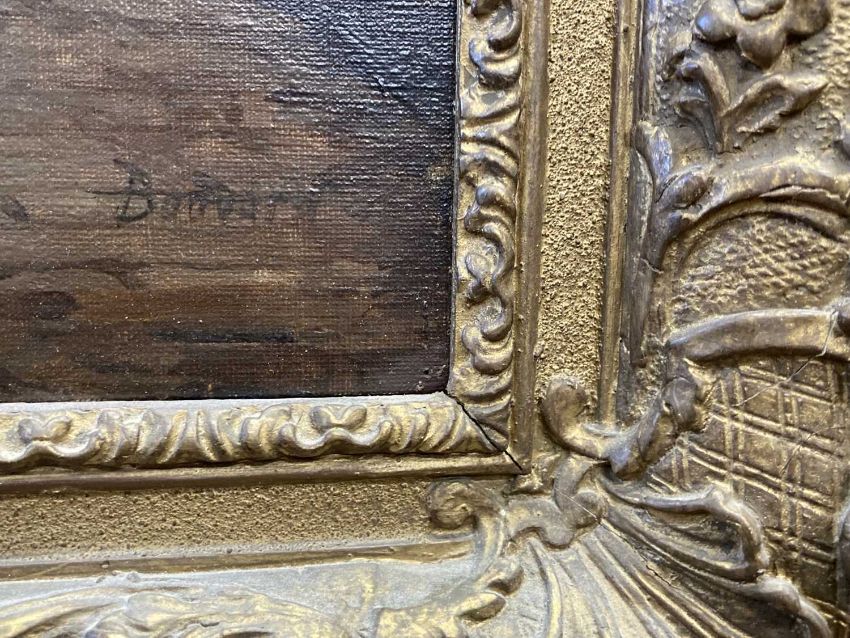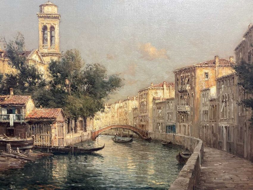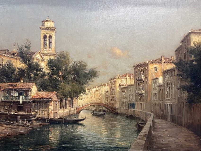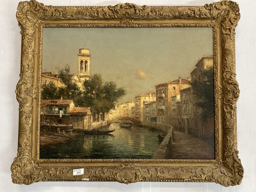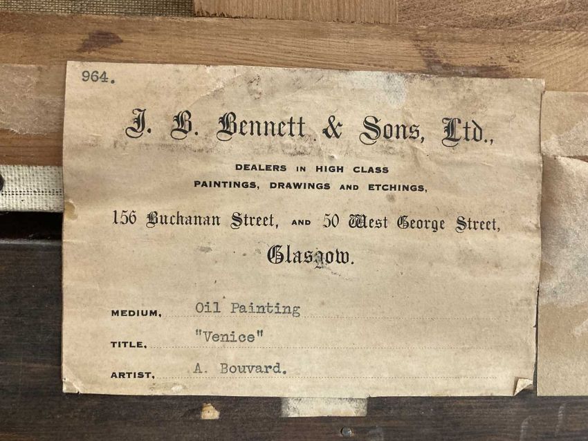 Pictures: Antoine Bouvard (French 1870-1955) Venetian Canal scenes with bridge and gondolas. 19 1/2 X 25 1/2 inches overall. In original gesso gilt frame.