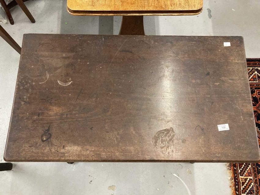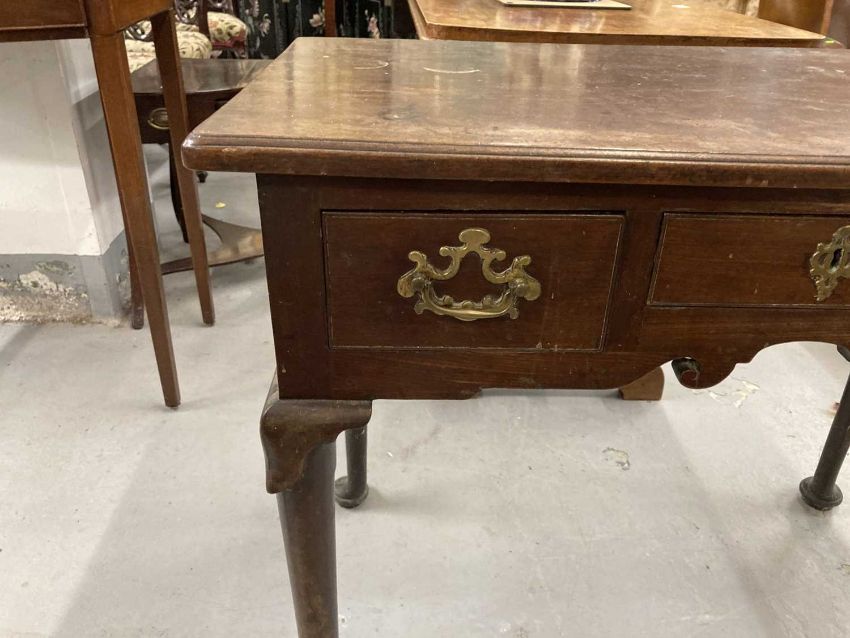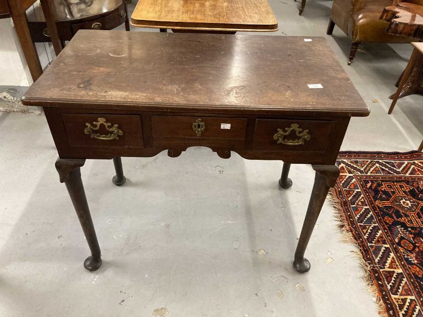 Furniture: 18th century lowboy, oak with original brass furniture. 3 drawers, whole rising of cab support, resting on pad feet.
