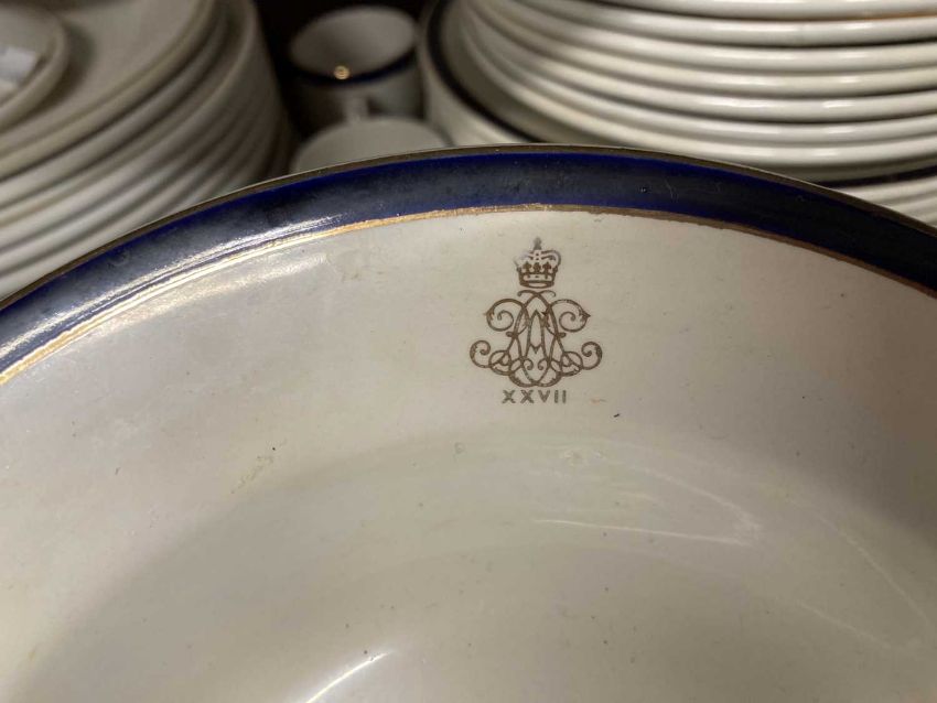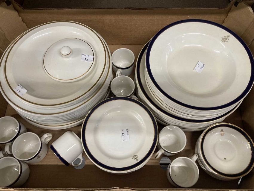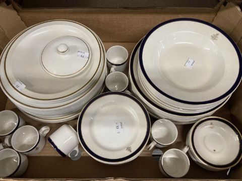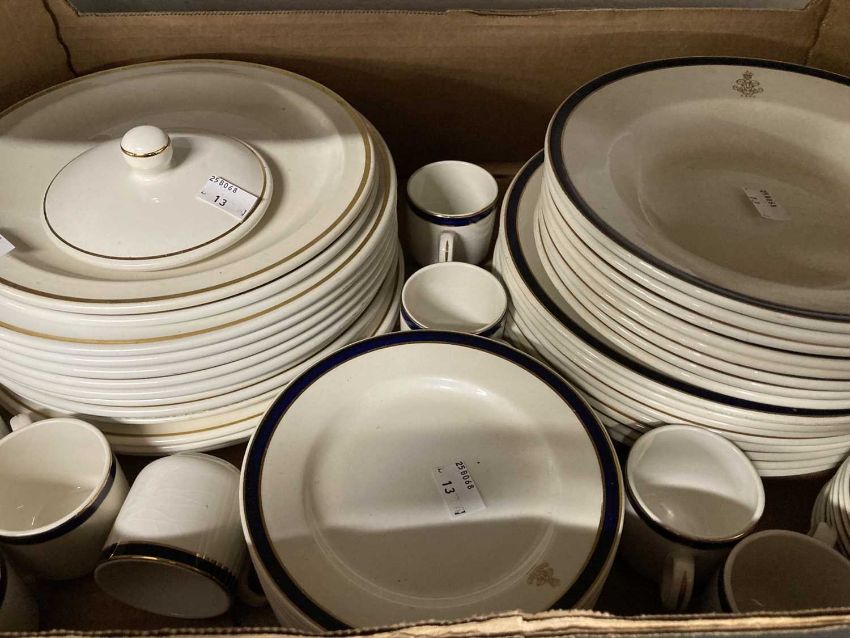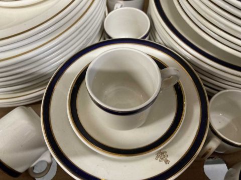 Ceramics: Falcon ware part dinner service with Military Crest, Royal Artillery 27 Field Regt. 8 dinner plates, 8 soup bowls, 8 side plates, 8 coffee cups & saucers, plus other dinnerware. (1 Box)